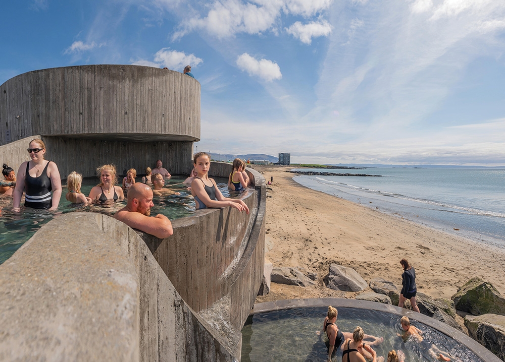 Perched at the edge of the North Atlantic in the coastal town of Akranes, Guðlaug is a striking example of minimalist Nordic design meeting elemental force. This tiered, open-air bathing structure spirals down from a warm top pool to cooler ones below, ending at the ocean. With concrete curves echoing the surrounding cliffs, and panoramic views across Faxaflói Bay, Guðlaug is as much a lookout as it is a soak. Locals and visitors alike gather here to embrace the Icelandic tradition of hot bathing in the cold weather, wind-lashed and open to the elements.